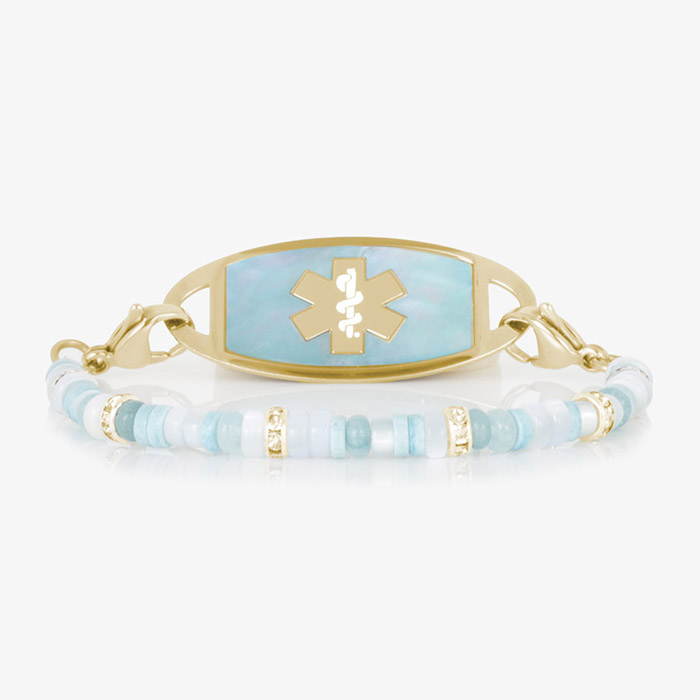 Blue mother-of-pearl and gold medical ID bracelet with a polished metal plate, featuring an engraved medical alert symbol for safety and elegance.